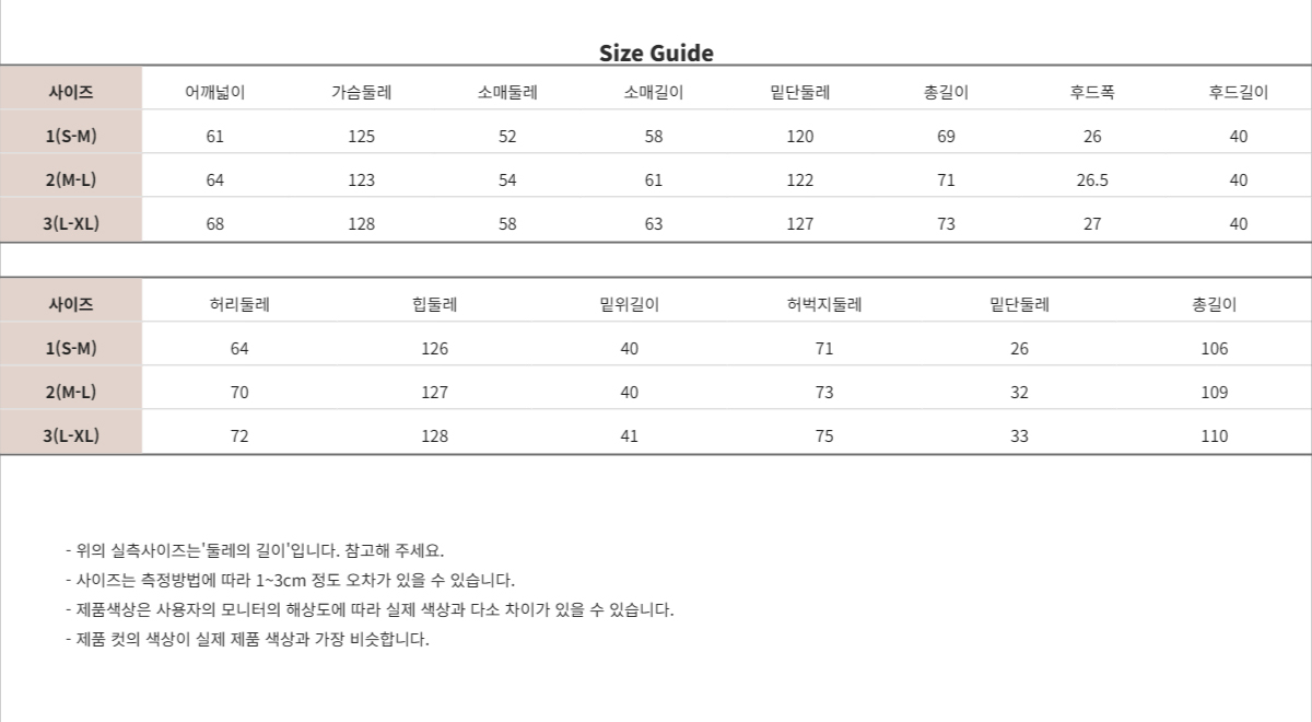 ※ 상품사이즈 치수는 재는 방법과 위치에 따라 1~3cm 오차가 있을 수 있습니다.